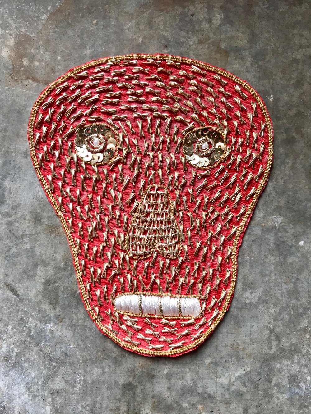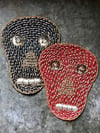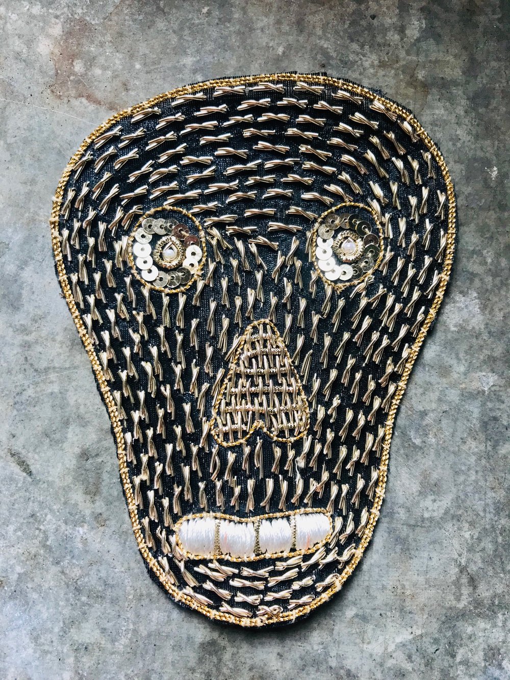 Sew on Skull appliqué embroidered with thread, beads, and sequins.